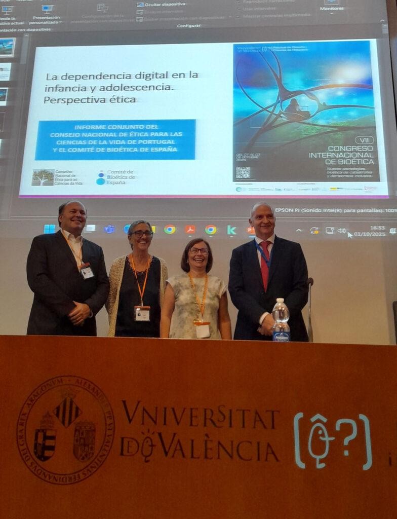 El presidente, D. Juan Carlos Siurana, y vicepresidenta, Dña. Isolina Riaño ambos del Comité de Bioética de España, junto al vicepresidente André Días, del Consejo Nacional de Ética para las Ciencias de la Vida de Portugal, han presentado los avances en el informe que están preparando con el sobre adicción a pantallas.
